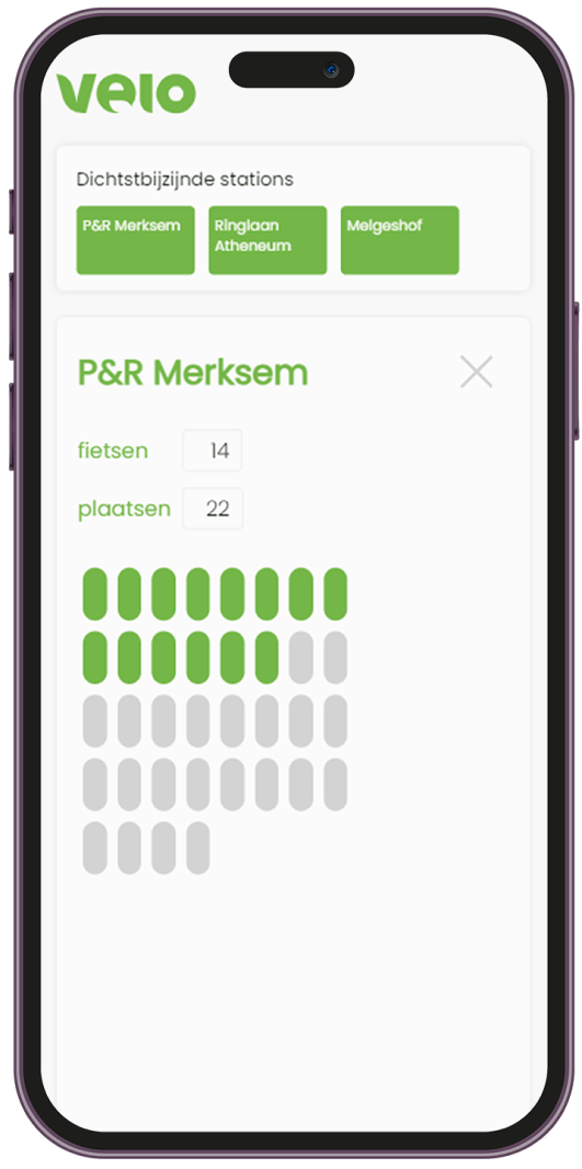 Velo is een mobile-first app, gebaseerd op de Velo-API en ontwikkeld met Next.js in React. Het logo van Velo Antwerpen is aangepast om een meer eco-vriendelijke uitstraling te geven. Met deze app kun je Velo-stations binnen een straal van 10 km vanuit jouw locatie in de provincie Antwerpen bekijken.